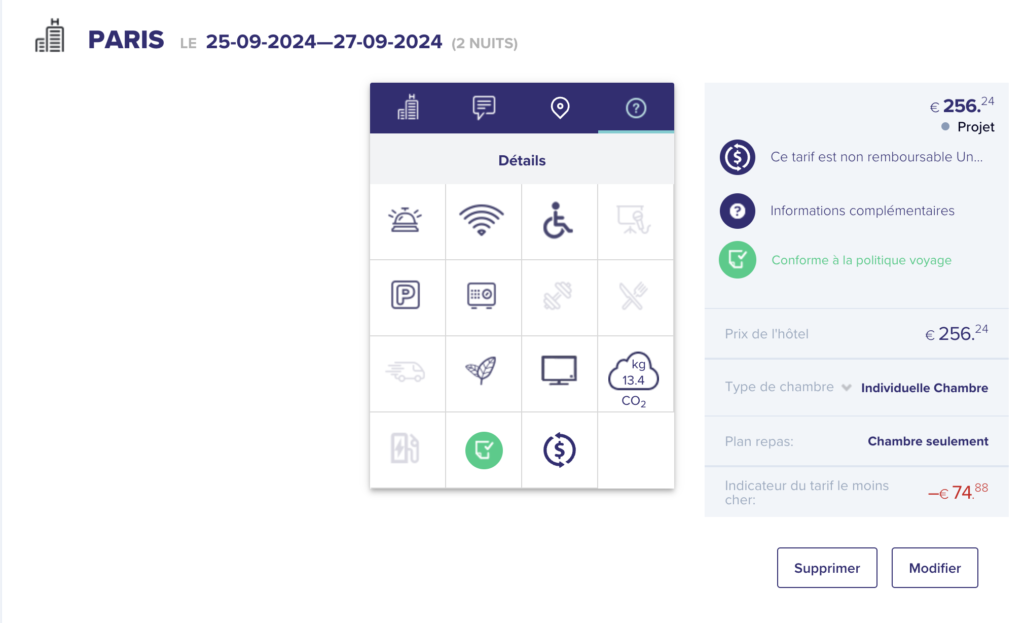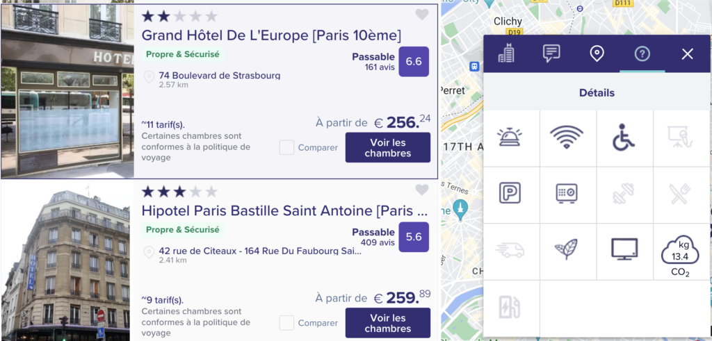 For hotel, carbon emissions are estimated for the entire stay, and you can find them by clicking on the selected hotel on the search result page, under the details tab, as well as in the cart view.